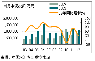 水泥行業(yè)的投資還沒有受到經(jīng)濟下行的帶來的明顯沖擊。12月當月完成投資109.32億元,同比增長31.33%,較11月份回落了49.28個百分點;1~12月水泥行業(yè)累計投資突破一千億元,達1,051.46億元,增長60.76%。