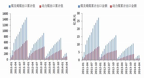 4月份我國煤及褐煤出口金額共計 4 111.46 億美元,其中動力煤出口金額 1 397.35 億美元,1 - 4月煤及褐煤出口累計金額29 752.51億美元,其中動力煤11 549.41億美元。