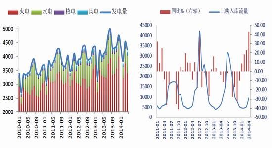 近一個月以來,南方雨水較為充沛,水電對火電的影響成為了市場關注的熱點。從三峽入庫流量來看,今年4月三峽平均入庫流量9622立方米/秒,同比上漲43.18%,較往年有所提前。從各種發(fā)電方式的占比來看,今年風電、核電及其他發(fā)電方式占總發(fā)電量的比例沒有變化,而水電發(fā)電量的提升擠壓了火電市場,今年4月水電發(fā)電量占發(fā)電總量的15%,火電占80%,而去年4月水電占總量的13%,火電占82%。