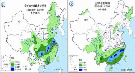 預計未來10天(5月24日至6月2日),主要降雨區(qū)位于江南、華南,累計降雨量有50-90毫米,部分地區(qū)有100-160毫米,局地可達180-260毫米。