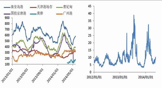 從期貨價格、環(huán)渤海動力煤指數(shù)及CCI1指數(shù)來看,數(shù)據(jù)相關性較高,且期貨表現(xiàn)出較強的領先性,目前期貨價格向下摸索,CCI1指數(shù)也出現(xiàn)下行跡象,環(huán)渤指數(shù)是否能繼續(xù)堅挺有待觀察。