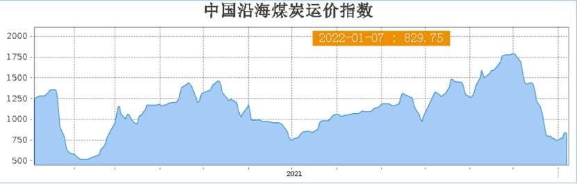 本周,沿海煤炭運價小幅反彈。截至1月7日沿海煤炭運價指數(shù)為829.75,較上周同期上漲80.84點,漲幅10.66%;較上月同期下跌854.67點,跌幅50.45%;較去年同期下跌427.92點,跌幅33.76%。