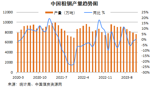 國家統(tǒng)計局數(shù)據(jù)顯示,2023年1-11月份,全國焦炭、粗鋼、生鐵和鋼材產量同比仍然表現(xiàn)增長。具體來看: