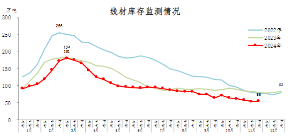 11月下旬,線(xiàn)材庫(kù)存55萬(wàn)噸,環(huán)比增加1萬(wàn)噸,上升1.9%,庫(kù)存由降轉(zhuǎn)升;比10月下旬減少7萬(wàn)噸,下降11.3%;比年初減少28萬(wàn)噸,下降33.7%;比上年同期減少26萬(wàn)噸,下降32.1%。