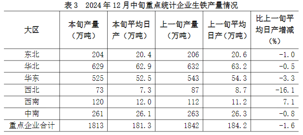 12月中旬六大地區(qū)中,除西南地區(qū)重點統(tǒng)計企業(yè)生鐵日產(chǎn)量較上一旬有所增長外,其它地區(qū)均有不同程度下降(詳見表3),具體為: