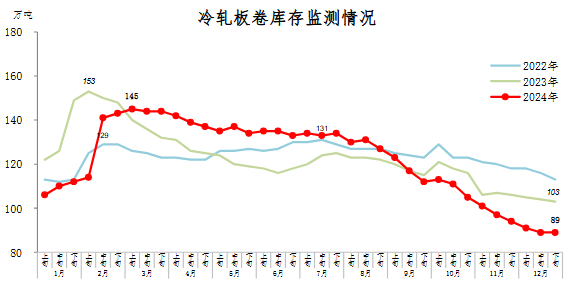 12月下旬,冷軋板卷庫存89萬噸,環(huán)比持平;比11月下旬減少5萬噸,下降5.3%;比上年同期減少14萬噸,下降13.6%。
