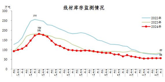 12月下旬,線材庫存56萬噸,環(huán)比持平,近期庫存較為穩(wěn)定;比11月下旬增加1萬噸,上升1.8%;比上年同期減少27萬噸,下降32.5%。