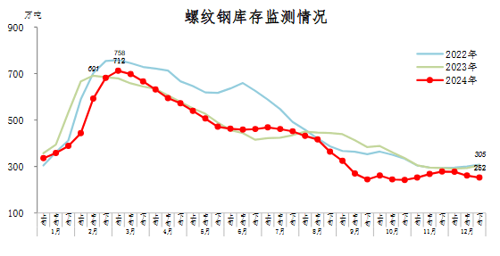 12月下旬,螺紋鋼庫存252萬噸,環(huán)比減少8萬噸,下降3.1%,庫存繼續(xù)下降,降幅有所收窄;比11月下旬減少26萬噸,下降9.4%;比上年同期減少53萬噸,下降17.4%。