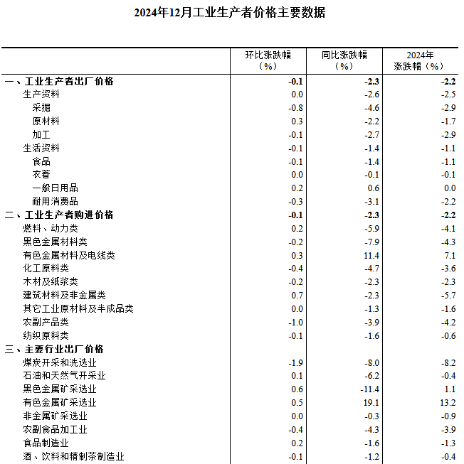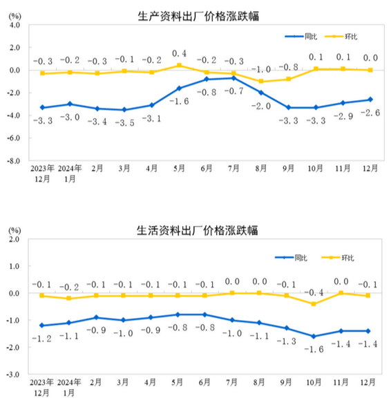 2024年12月份,全國工業(yè)生產(chǎn)者出廠價(jià)格和購進(jìn)價(jià)格同比均下降2.3%,降幅比上月均收窄0.2個(gè)百分點(diǎn);環(huán)比均下降0.1%。2024年全年,工業(yè)生產(chǎn)者出廠價(jià)格和購進(jìn)價(jià)格均下降2.2%,降幅比上年分別收窄0.8、1.4個(gè)百分點(diǎn)。