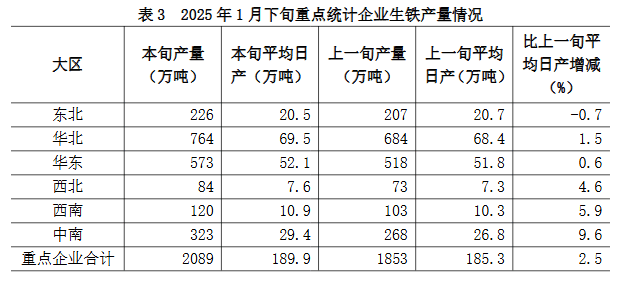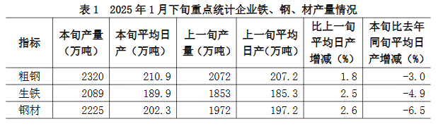 2025年1月下旬,重點(diǎn)統(tǒng)計(jì)鋼鐵企業(yè)共生產(chǎn)粗鋼2320萬(wàn)噸,平均日產(chǎn)210.9萬(wàn)噸,日產(chǎn)環(huán)比增長(zhǎng)1.8%;生鐵2089萬(wàn)噸,平均日產(chǎn)189.9萬(wàn)噸,日產(chǎn)環(huán)比增長(zhǎng)2.5%;鋼材2225萬(wàn)噸,平均日產(chǎn)202.3萬(wàn)噸,日產(chǎn)環(huán)比增長(zhǎng)2.6%(見(jiàn)表1)。