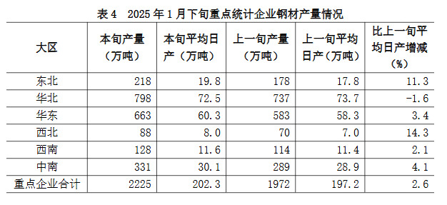 1月下旬六大地區(qū)中,除華北地區(qū)重點(diǎn)統(tǒng)計(jì)企業(yè)鋼材日產(chǎn)量較上一旬下降外,其它地區(qū)均有所增長(zhǎng)(詳見(jiàn)表4),具體為: