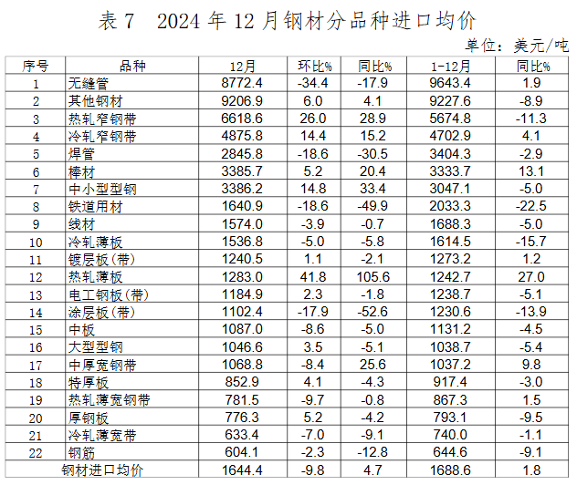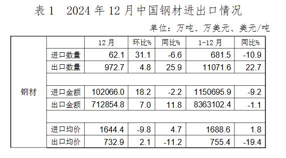 2024年12月,我國(guó)出口鋼材972.7萬(wàn)噸,環(huán)比增長(zhǎng)4.8%,出口均價(jià)732.9美元/噸,環(huán)比小幅回升2.1%。1-12月,我國(guó)累計(jì)出口鋼材11071.6萬(wàn)噸,同比增長(zhǎng)22.7%,出口均價(jià)755.4美元/噸,同比下降19.4%。12月,我國(guó)進(jìn)口鋼材62.1萬(wàn)噸,環(huán)比增長(zhǎng)31.1%,進(jìn)口均價(jià)1644.4美元/噸,環(huán)比下降9.8%。1-12月,我國(guó)累計(jì)進(jìn)口鋼材681.5萬(wàn)噸,同比下降10.9%,進(jìn)口均價(jià)1688.6美元/噸,同比增長(zhǎng)1.8%。