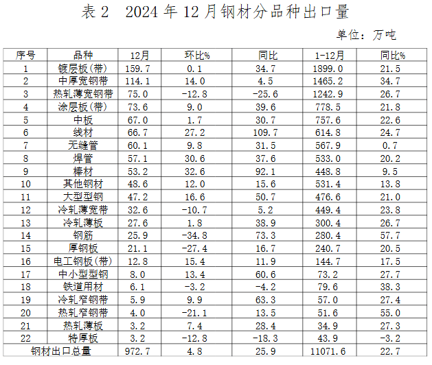 2024年,出口量1000萬(wàn)噸以上的品種有鍍層板、中厚寬鋼帶和熱軋薄寬鋼帶,出口量500至1000萬(wàn)噸的品種包括涂層板、中板、線材、無(wú)縫管和焊管。除特厚板外,其他21類品種出口均不同幅度增長(zhǎng)。