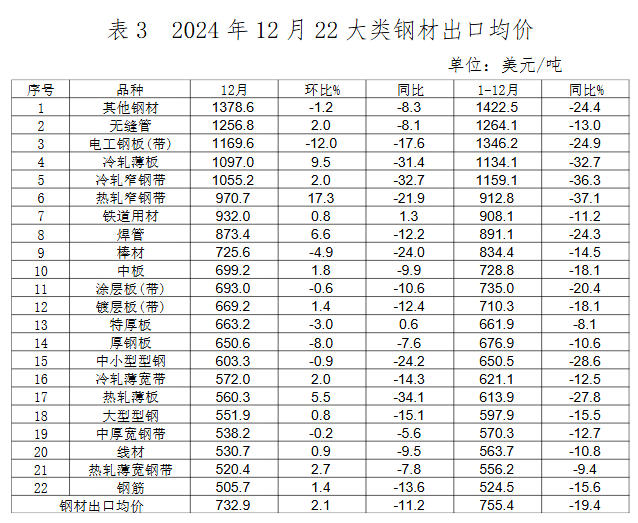 2024年12月,棒線材、焊管出口環(huán)比增長(zhǎng)幅度較大,熱軋薄寬鋼帶、冷軋薄寬鋼帶、厚鋼板等板材類產(chǎn)品出口環(huán)比下降,鋼筋出口環(huán)比大幅下降。出口的主要品種為鍍層板(帶)、中厚寬鋼帶、熱軋薄寬鋼帶、涂層板(帶)和中板,占12月鋼材出口總量的50.3%。熱軋板卷、鍍層板等主要品種出口均價(jià)小幅回升,電工鋼出口數(shù)量環(huán)比增長(zhǎng),價(jià)格大幅下降。12月鋼坯出口量環(huán)比下降,價(jià)格環(huán)比上漲。