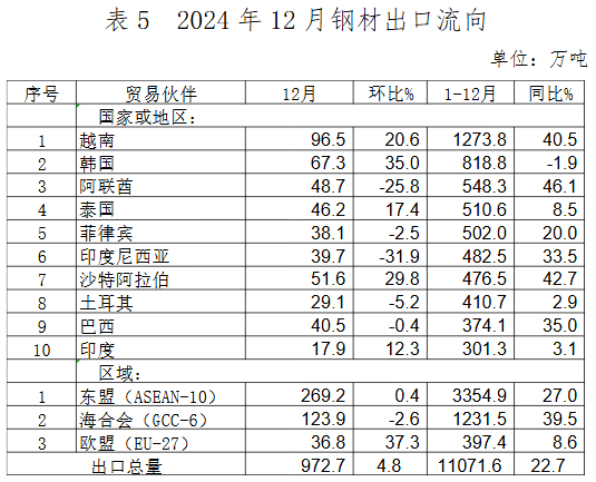 12月,我國(guó)鋼材出口的主要區(qū)域仍集中在以韓國(guó)、東盟以及海合會(huì)國(guó)家為代表的亞洲地區(qū),對(duì)多數(shù)國(guó)家出口環(huán)比出現(xiàn)下降。