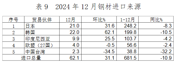 鋼材進(jìn)口來(lái)源持續(xù)穩(wěn)定,12月自日本、韓國(guó)和印度尼西亞進(jìn)口鋼材數(shù)量環(huán)比增幅較大,自中國(guó)臺(tái)灣進(jìn)口持續(xù)下降。日本、韓國(guó)和印度尼西亞是我鋼材進(jìn)口的主要來(lái)源,2024年自上述三國(guó)進(jìn)口占我國(guó)鋼材進(jìn)口總量的81.0%。