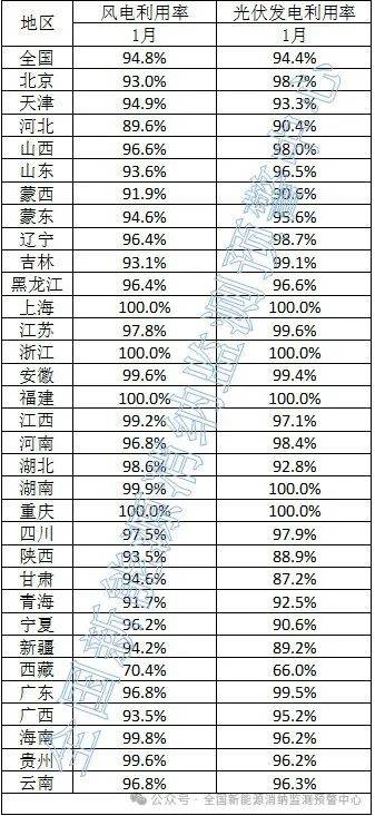 2025年3月3日,全國(guó)新能源消納監(jiān)測(cè)預(yù)警中心微信公眾號(hào)公布了各省級(jí)區(qū)域新能源并網(wǎng)消納情況。其中,2025年1月,光伏發(fā)電利用率光伏94.4%,風(fēng)電94.8%。