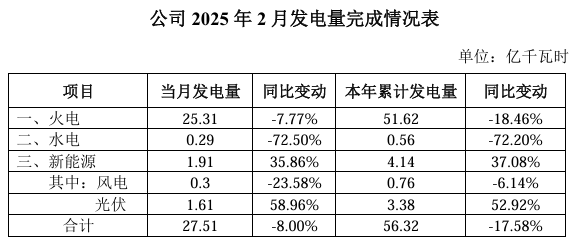 3月5日,長源電力發(fā)布公告,2025年2月,公司完成發(fā)電量27.51億千瓦時,同比降低8.00%。其中火電發(fā)電量同比降低7.77%,水電發(fā)電量同比降低72.50%,新能源發(fā)電量同比增長35.86%。